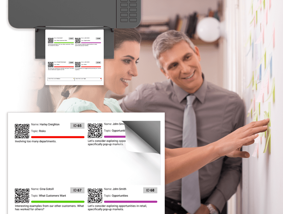 Notes can be printed on demand and grouped by category on a physical wall.