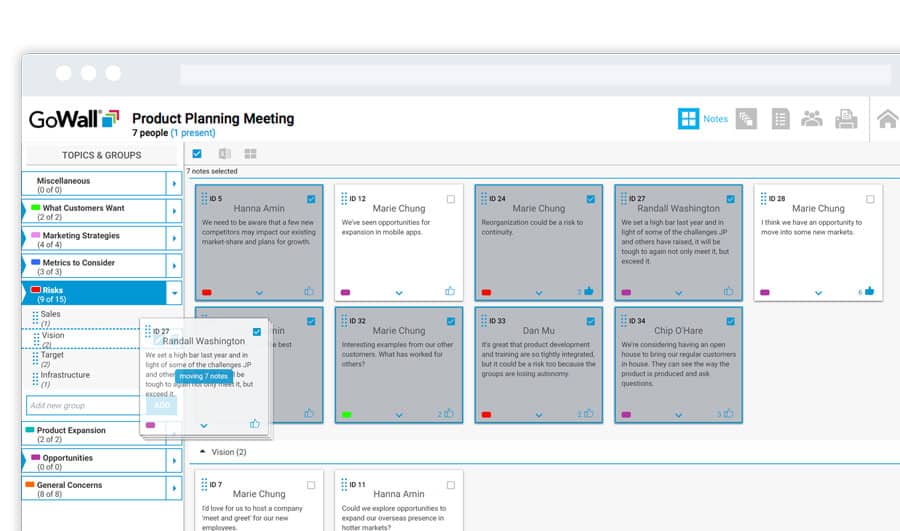 Grouped notes can be scanned back into GoWall using any iOS device and exported to Excel®. GoWall is the only collaboration app that completely supports in-room and virtual meetings.
